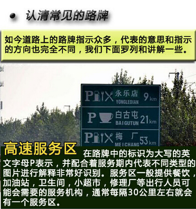 【正确认识高速公路指示牌】在发生的高速路交通事故当中,精力不够集中、对高速公路指示牌不熟悉而造成慌乱,进而产生突然停车、突然并线等一系列错误行为,是造成事故多发的主要推手。因此,无论老手还是新驾,多了解高速公路的保命常识依然至关重要。