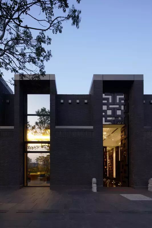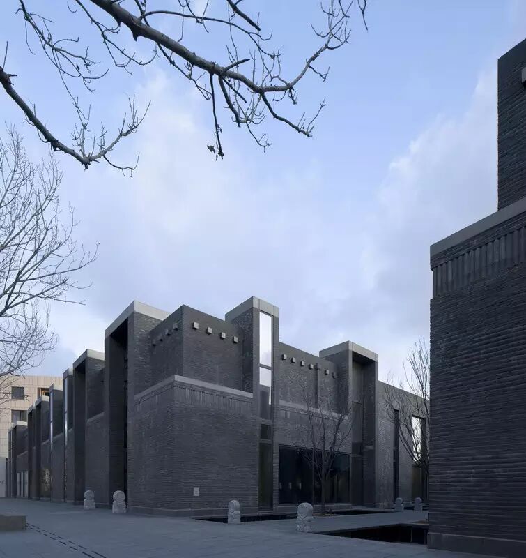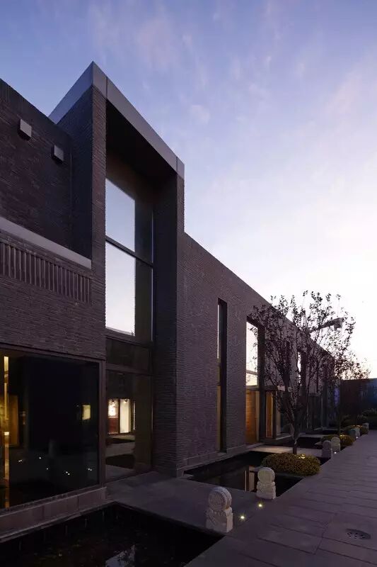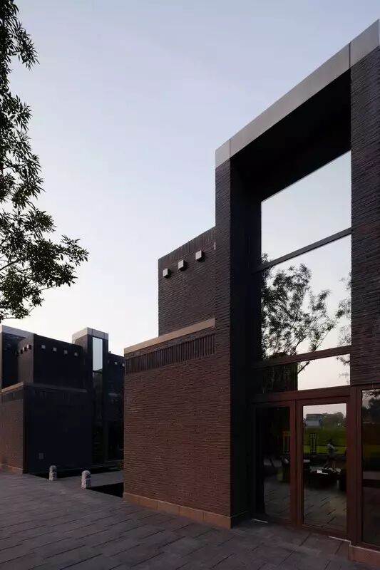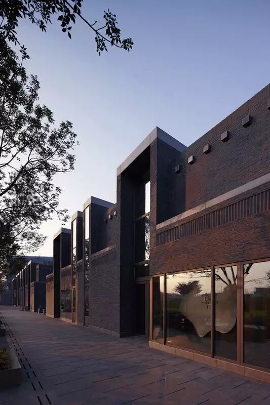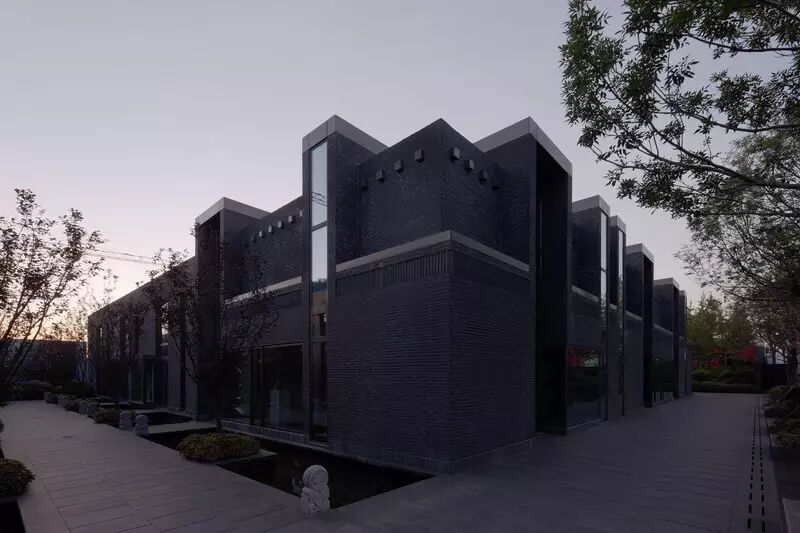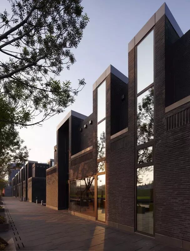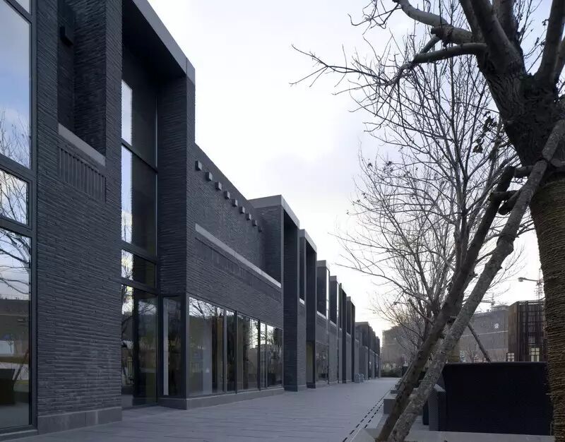 两栋建筑之间的小街成为小区入口的商业内街,内街和主立面前面结合平面凸凹设置浅水池和立灯,结合院子的中式主题。立面材料采用灰色劈岩砖形成横线肌理。局部还使用了预制混凝土构件和金属装饰板。