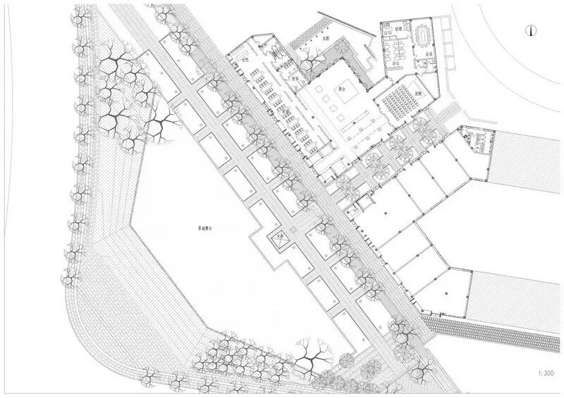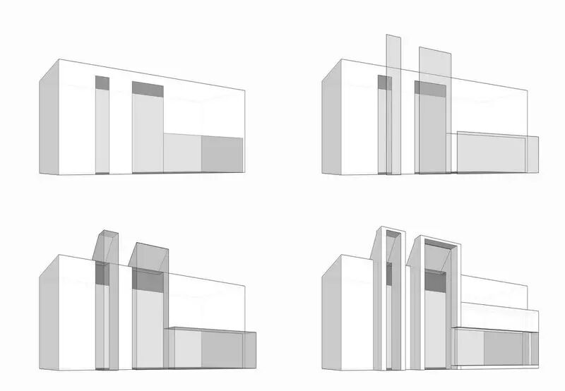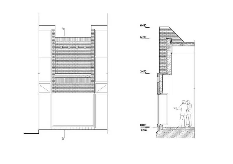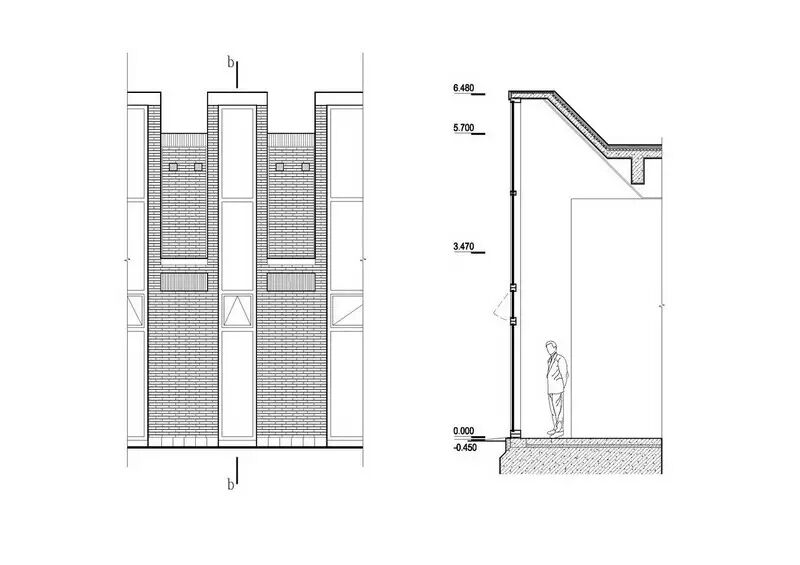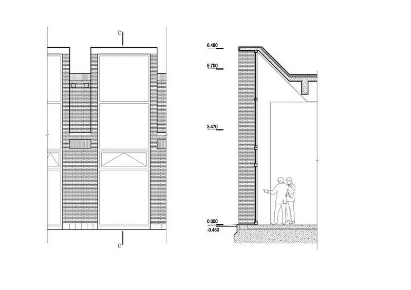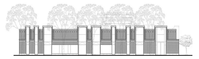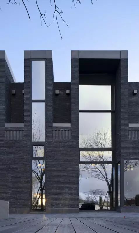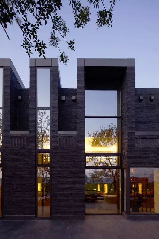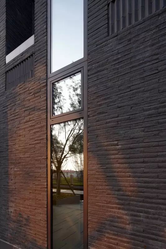 立面设计突出了“窗”和“墙”的语汇,通过平面的进退建立层次感,产生出一组属于窗户的空间。立面上遵循模数形成宽窄不一的高大通透的窗户。窗户剖面轮廓将屋顶线突破,给洽谈区带来更广阔的视野。这样的处理也模糊了天光和窗户的边界,给室内带来充足的光线。朝向小区的立面则采用了细窄窗以减弱对居民的影响。