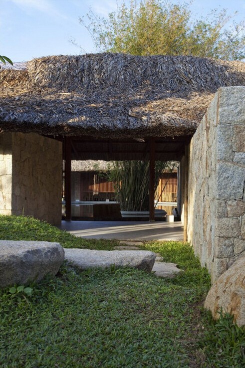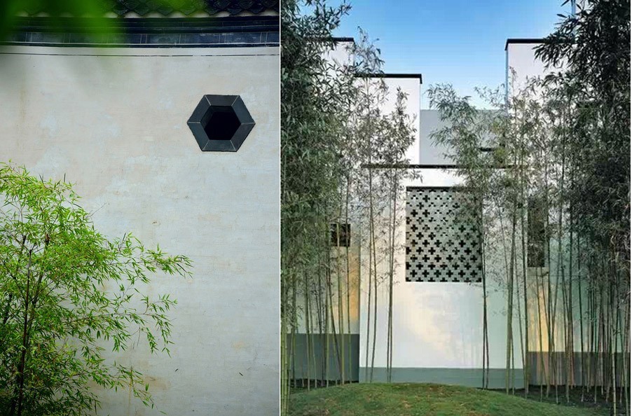 选择较低矮的竹类,如观音竹,在屋基、墙角种植,以其独特的形态与质地柔化建筑物的生硬线条,使得空间显得和谐而有生气。