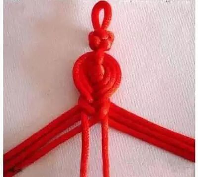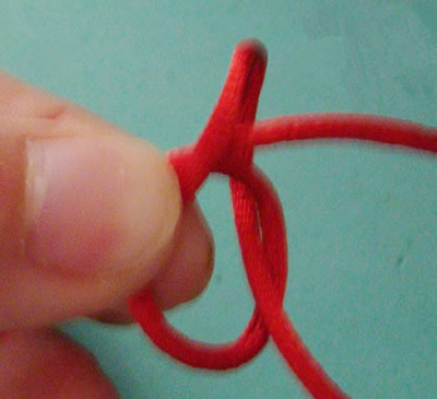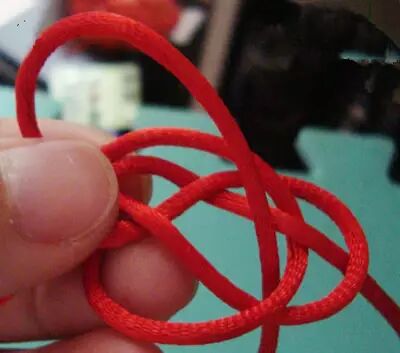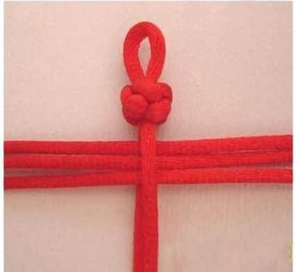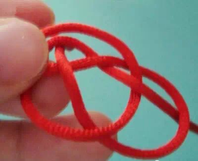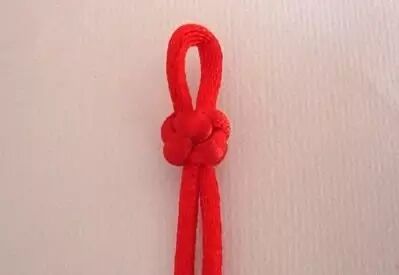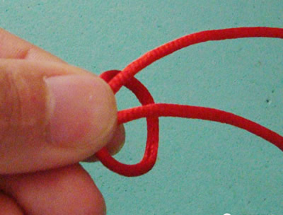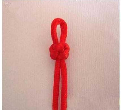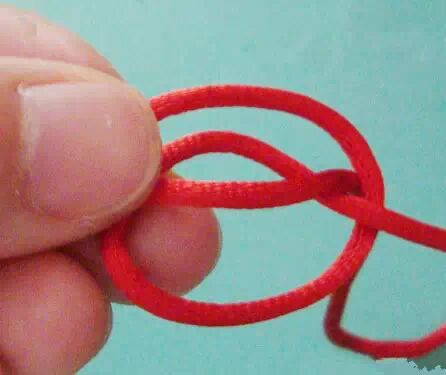 第一步:将红绳对折,并在一端编一个纽扣结,这样做是为了方便下一个步骤能顺利进行,不让红绳跑出来,注意大家在编织的时候要在上端留出一个扣眼,如图所示~