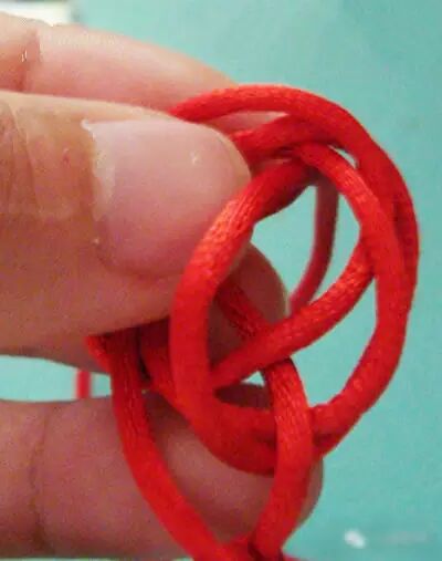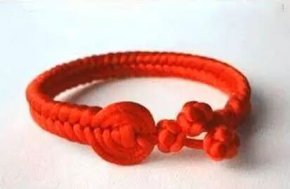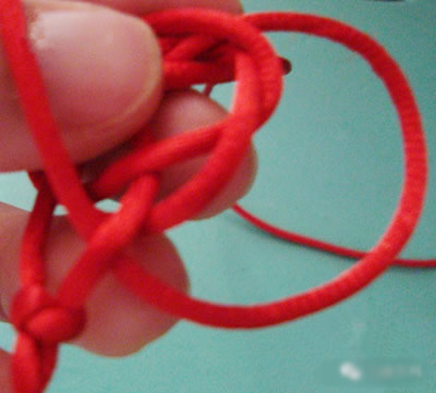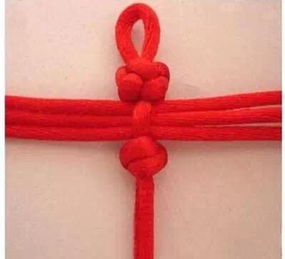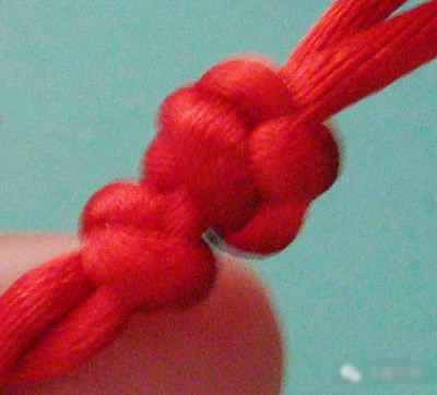 第八步:再将余下的线编一个或者两个,最多不要超过两个纽扣结,这样我们就完成的红绳手链的编织啦。