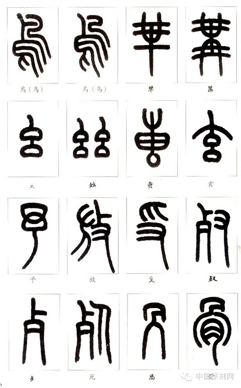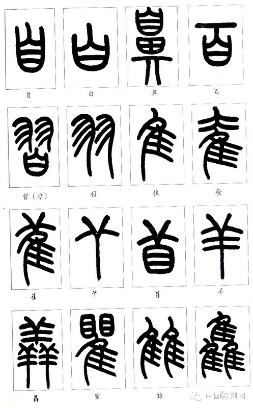第四,将特殊篆字,如父、牙、花、鸟、乌、必、庚、康、焉、惊、学、头等这些不能用部首对应规律来加以识别的篆字收在一起,以便硬记。