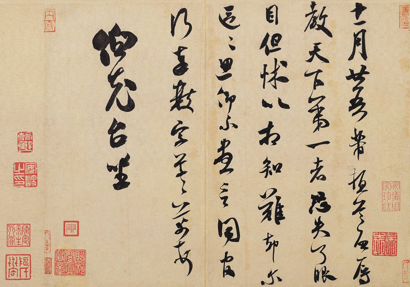 释文:芾箧中怀素帖如何。乃长安李氏之物。王起部、薛道祖一见。便惊云。自李归黄氏者也。芾购于任道家。一年扬州送酒百馀尊。其他不论。帖公亦尝见也。如许。即并驰上。研山明日归也。更乞一言。芾顿首再拜。景文隰公阁下。