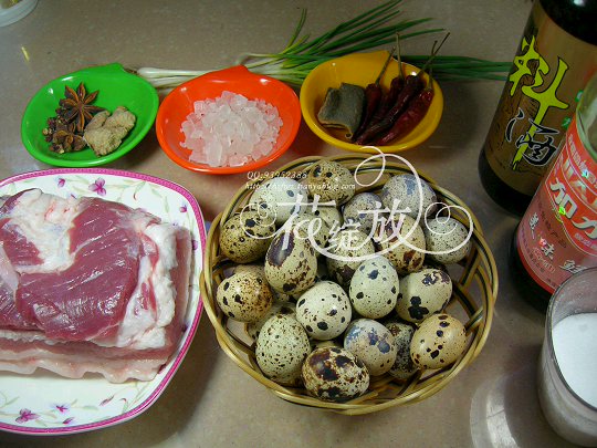 3、五花肉捞出后切成约一厘米见方的块(可依个人喜欢的大小切块);鹌鹑蛋取出后用凉水浸泡约五分钟后去壳,用厨房用纸拭干水分;老姜拍破;香葱切成两段;