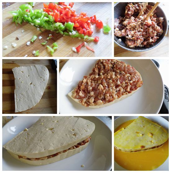 青椒,香菇,洋葱,生抽,胡椒粉,淀粉,鸡蛋液,橄榄油,姜末,大葱,肉馅。