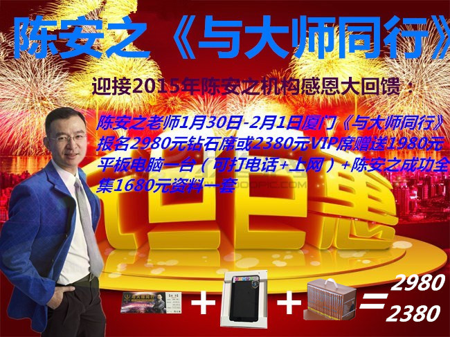 陈安之老师1月30-2月1日厦门《与大师同行》元旦期间报名2980元钻石席或2380元VIP席赠送1980元平板电脑一台(可打电话+上网)+陈安之成功全集1680元资料一套