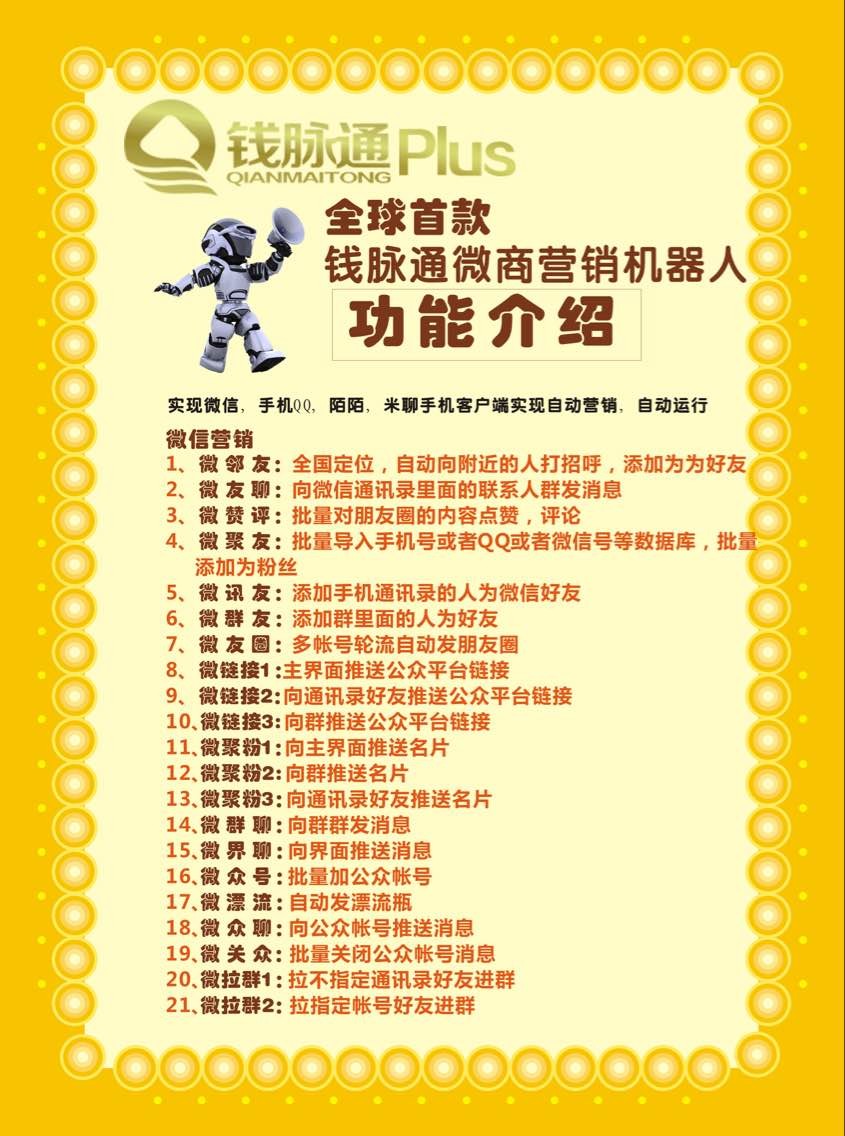钱脉通微营销机器人Plus版是一款基于微商营销理念打造的智能微营销机器人,有微商拓客神器之称!感兴趣的朋友赶紧关注一下!