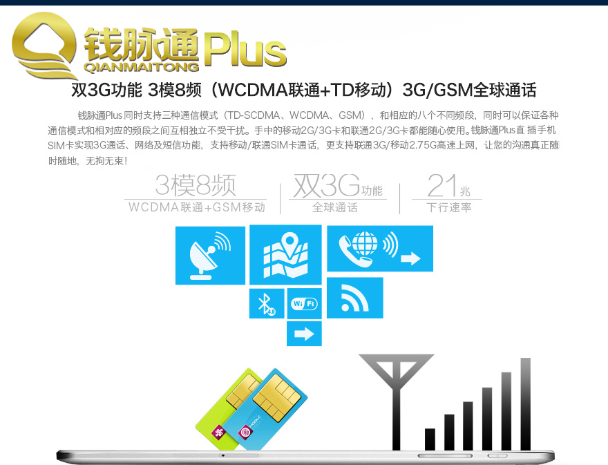 同时支持三种通信模式(TD-SCDMA、WCDMA、GSM),和相应的八个不同频段,同时可以保证各种通信模式和相对应的频段之间互相独立不受干扰,手中的移动2G/3G卡和联通2G/3G卡都能随心使用。