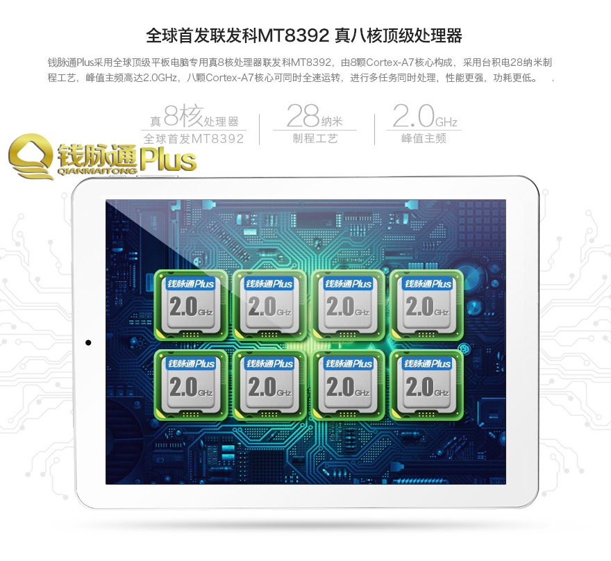 钱脉通微营销机器人Plus版采用真8核处理器联发科MT8392,由8颗Cortex-A7核心构成,采用台积电28纳米制程工艺,峰值主频高达2.0GHz,八颗Cortex-A7核心可同时全速运转,进行多任务同时处理,性能更强,功耗更低。