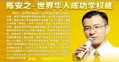 中国6万亿万富翁,平均年龄37岁,95%白手起家!10年后,中国亿万富翁将超过30万人,其中有您吗?为什么那么多亿万富翁都在跟随陈安之?成功学是全球的趋势啊!陈安之吸收了成功学的精髓,总结出了国际级企业家的成功经验。陈安之老师成功学让您的财富……在短短的三个月内……像闪电般的增长!接下来的5分钟,您绝对不该错过,21世纪比的不是学历和能力!比的是远见,远见和潜意识需要潜能开发。潜意识的力量比意识的力量大三万倍。