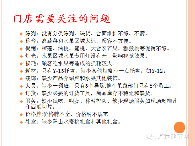 生鲜经营提倡的是抓好基础管理,做好基础工作,不好高骛远,因为自己企业或者门店存在的问题只有自己最清楚。