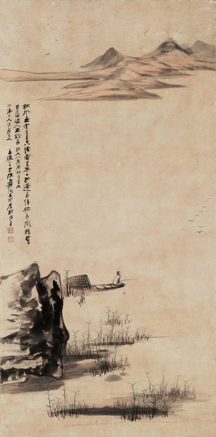 17 山色空蒙翠欲流,长江清澈一天秋。茅茨落日寒烟外,久立行人待渔舟。