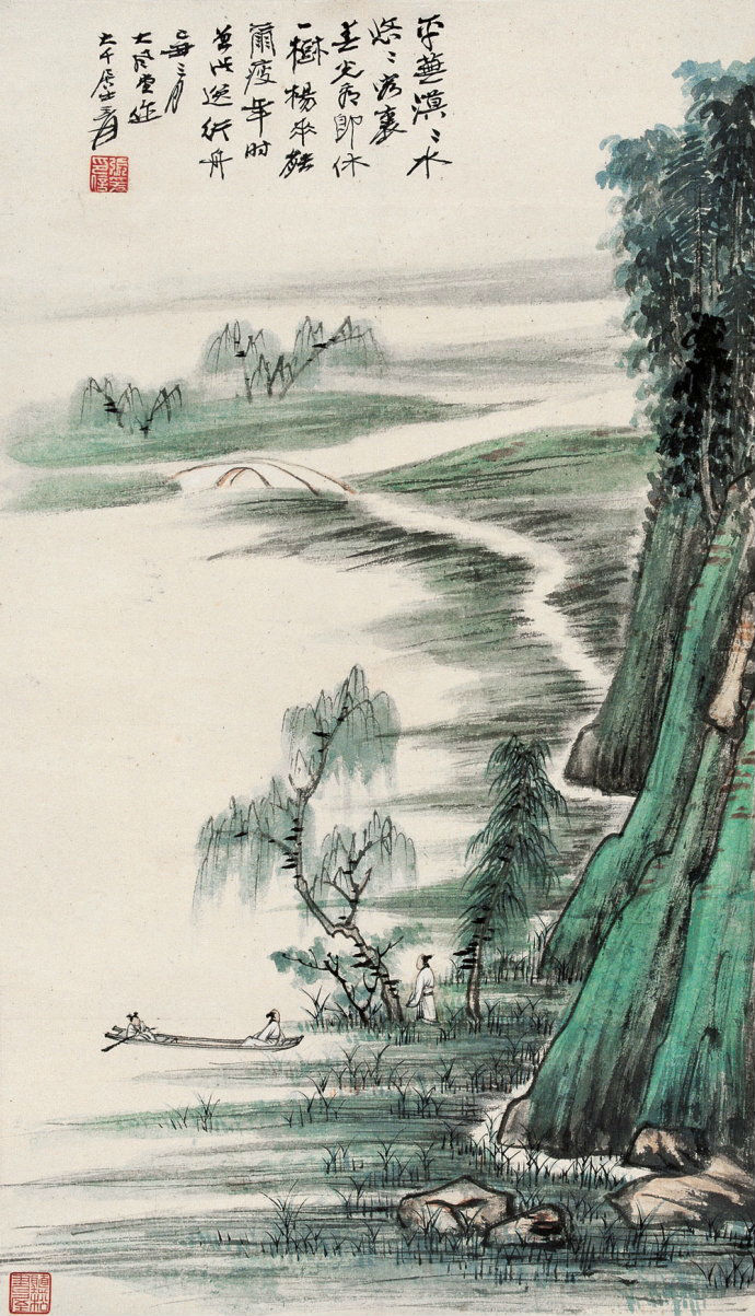 25 范宽墨法似营丘,散落人家二百秋。咫尺画图千里思,山清水碧不胜愁。