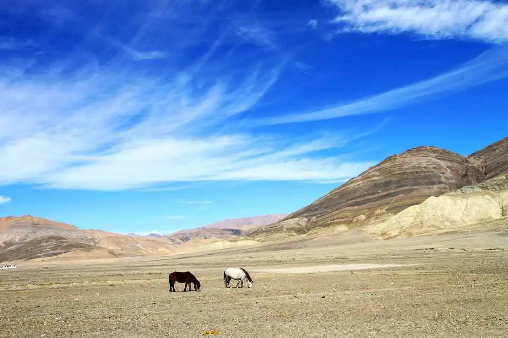 蓝天、白云:西藏的天就是那种一碧如洗的蓝,澄净空明,蓝得让人忧伤,又总是点缀着变幻莫测的云。早上的云,气象万千而捉摸不定,神奇地象哈达似地缠着绕着山脉。中午的云,象松软的羊毛,蓬松而透亮,在无风的蓝天上缓慢、慵懒的变幻着。