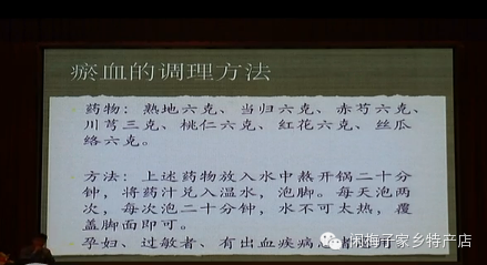 第二个方子当有瘀血之后怎么办?刚才有很多朋友问,有瘀血怎么办,用这个方子泡脚,这是中医的经典方子叫桃红丝五汤(音),我给加了一个丝瓜络,用这个方子泡脚,能够把瘀血化掉,熬水,大家记住了,用砂锅,不要用金属的锅,熬水之后,红花在药店买就行了,熟地是补肾的,我们要一边通络一边养,当归是干嘛的,养血的,活血的,赤芍也是活血的,川芎活血、形气的,桃仁化有形的瘀血,红花化无形的瘀血,细微瘀血,丝瓜络通经络。如果受寒了还可以加点艾叶,往里加2、3克的艾叶,没受寒用这个方法泡就行。如果腰疼的话,加桑枝和丝瓜络,就是加桑枝,丝瓜络已经有了,桑树的枝药店有卖的,桑枝加6克,用了以后腰疼就消失了,好多人腰疼是瘀血导致的。这个方子大家可以泡脚,效果很好,泡到舌下静脉干净为止,刚才我说有个朋友有点瘀血,那么怎么办呢?把瘀血泡到化掉的情况,瘀血化掉以后身体就恢复了.方子下方图片中(孕妇,过敏者,有出血疾病患者忌用)。