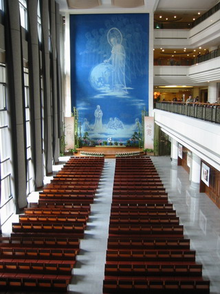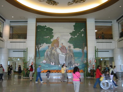 从一楼可以俯瞰地下一层的佛法宣导场所。这里不但是医院的佛教信众举行宗教仪式的场所,也是医院开会或讲授公共课程的地方。也常有一些公共卫生知识的讲座,提供给民众一些医疗方面的辅导。