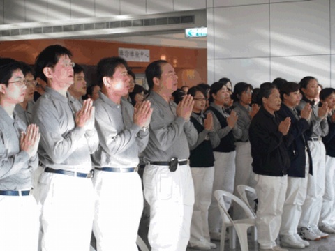 台中佛教慈济医院同仁聚集在大厅,双手合十礼赞世尊,颂念佛经。