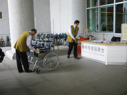 在医院门口有免费租借轮椅的服务,提供行动不便的患者使用,身穿志工服的志工,在患者还未进入医院大门就开始服务了。
