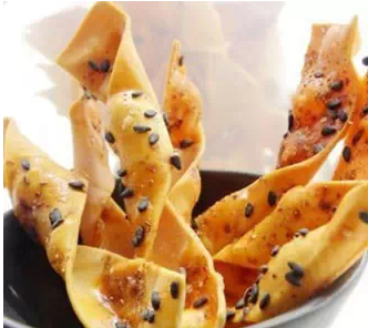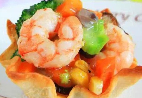8.将炒好的菜盛入烤好的馄饨皮金盏中即可