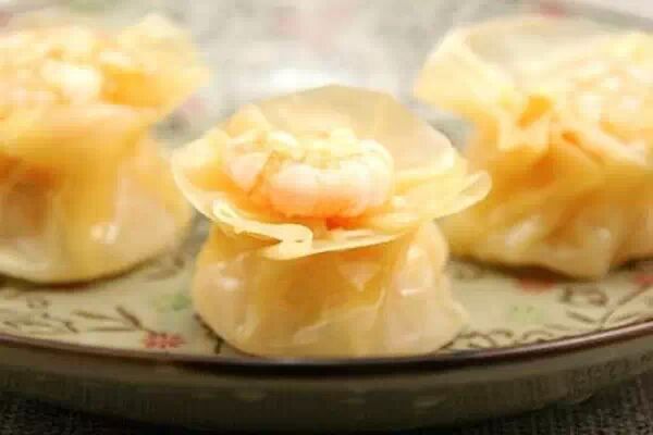 8.取一张皮放掌心上,取适量虾仁馅放面皮上,置于左手拇指和食指间慢慢收拢,捏成上下大、中间小状,收口处捏成花瓣状,顶部放上一个虾仁