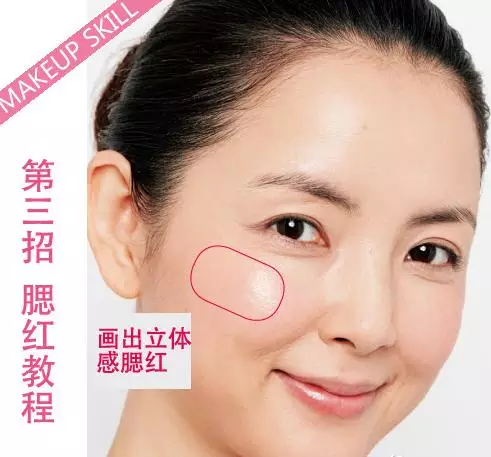 1、粉色腮红顺着微笑时突出的苹果肌扫。
