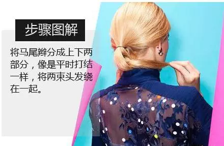 step2、将马尾绑好后,再将马尾分成上下两部分,像平时打结一样,将这两束头发缠绕在一起。