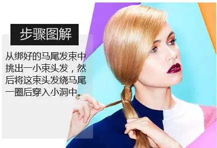 step2、将马尾辫绑好后,从绑好的马尾中挑出一小束头发,然后再将这束头缠绕在马尾上,缠绕一圈后,从小洞中穿过。