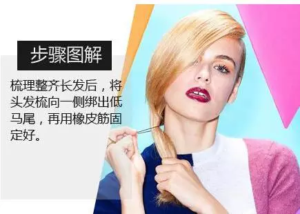 step1、将头发散开,打理好后,将头发全部梳向一侧,然后再绑成一个低马尾的样式,取出橡皮筋绑好即可。
