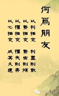 当然最近还有马云等这样的朋友。我们这个圈子的规则,第一要真诚,要坦率,要赤裸裸。你不能装,你在这个小范围内再装,那更不是玩意儿!你说人多没有办法,你不装一下会影响别人的情绪,你装一下可以,如果就三五个人你还装,那纯粹是侮辱别人的智商;第二是不要有功利目的,无所求是最高境界;还有一个游戏规则就是要谦虚,水为什么越积越多,因为地势低,低的东西才能吸纳更多的资本,在朋友圈子里也一样,要谦虚。你不够谦虚,你总是希望教导别人,加上你再装,基本上很快被人踢出去了。所以说这样小范围地交朋友,真实、谦虚、没有功利色彩,大家都会舒服。