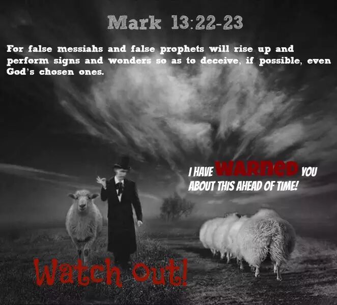 (图为:马可福音13:22-23 因为假基督,假先知将要起来,显神迹奇事,倘若能行,就把选民迷惑了。你们要谨慎。看哪,凡事我都预先告诉你们了。)