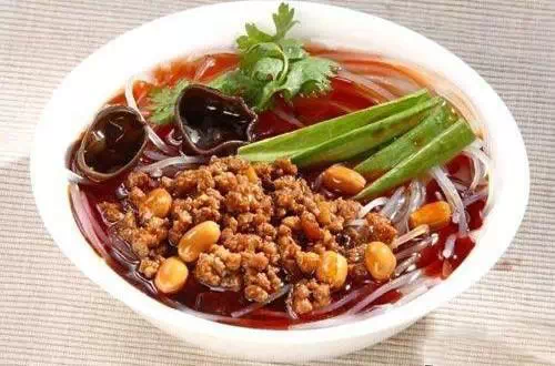 8、红薯粉垫点,浇上酸辣汤,撒上熟芝麻,炸花生,青菜,香菜末即可。