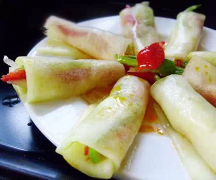 做法:1)西瓜皮去净瓜瓤,削去青衣,片成薄片,青红椒,嫩姜切细丝。2)将西瓜片,青红椒丝,姜丝放入盐水中浸渍10分钟取出。3)将西瓜皮挤去水分摊平,放上几根青红椒及姜丝,卷成卷筒状。4)全部做好后,放在碗里,撒上白糖,加入醋,辣椒油,盖上盖冰箱冷藏1小时,装盘