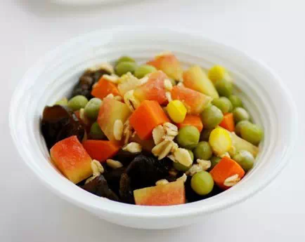 做法:1)削去西瓜皮绿色的硬皮部分,留一层红瓤,切成1厘米左右的瓜皮丁,胡萝卜去皮切丁,木耳用清水泡发、撕成小朵,燕麦片用清水浸泡;2)锅中烧水,水开后放入豌豆焯烫;3)锅中加少许油,烧热后放入胡萝卜丁和木耳,翻炒1分钟;4)加入瓜皮丁,翻炒炒匀;5)加入豌豆和玉米粒,再次炒匀;6)加入泡软的燕麦片,翻炒2分钟左右;7)调入盐和鸡精,翻炒炒匀后即可。