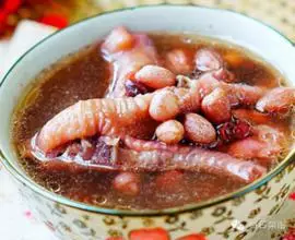 四、红豆花生米凤爪汤食材:红豆50g、花生米50g、鸡爪300g、盐适量、猪龙骨适量、生姜适量、八角适量