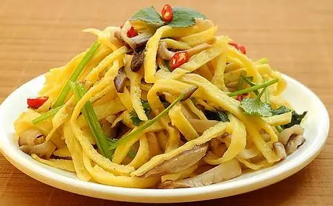 11.蛋皮丝﹑香菇丝和香菜放入一个大碗内。