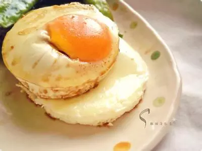 3、表面金黄后翻面,火一定不要大,不然蛋清就糊了,煎好的鸡蛋 装盘待用;