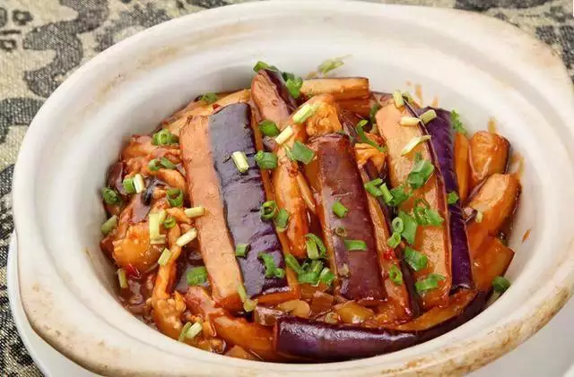 鱼香茄子煲原料:茄瓜500克,鸡粒100克,炸香咸鱼茸10克,煲仔酱30克,西芹菜粒50克,青、红椒粒20克,上汤1杯,绍酒、蒜茸、葱花、深色酱油、香油各适量。