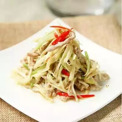 仔姜炒肉丝主 料:鲜猪肉二两,仔姜二两,青红椒各一只,大葱取葱白二寸一段