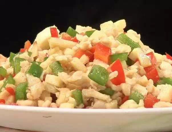 3)将藕丁倒入锅中煸炒2分钟,再依次倒入醋、糖、少许水和盐,继续加热5分钟,撒一点鸡精即可。