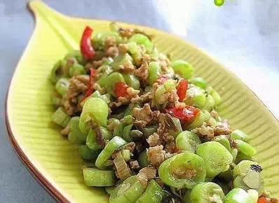 4、起油锅,下蒜蓉爆香后把刀豆粒煸至皱皮,最后放入榄菜肉末拌匀,调味后煸炒即可。