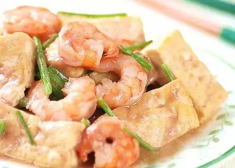 虾酱烧豆腐原料:北豆腐一盒 鲜虾100克 芹菜100克虾酱1汤匙(15克)姜3片料酒一茶匙(5ml)水淀粉1汤匙(15ml)