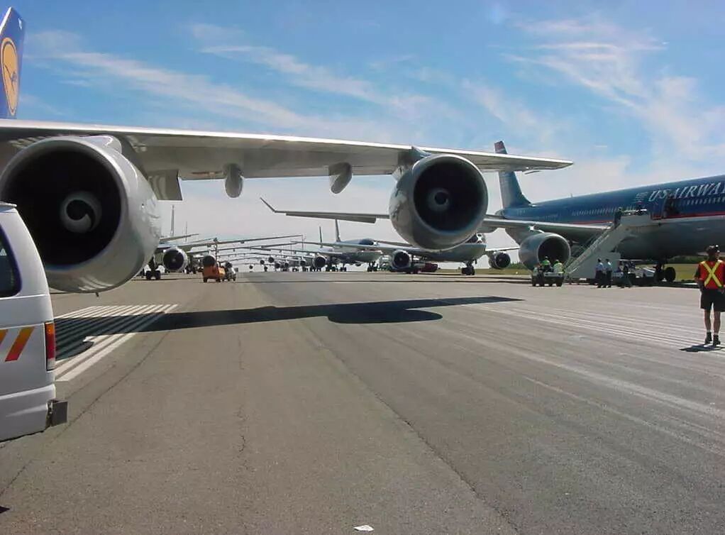 大批欧洲飞来的航班备降加拿大哈利法克斯机场,由于飞机太多,不得不分成两排停在跑道上。