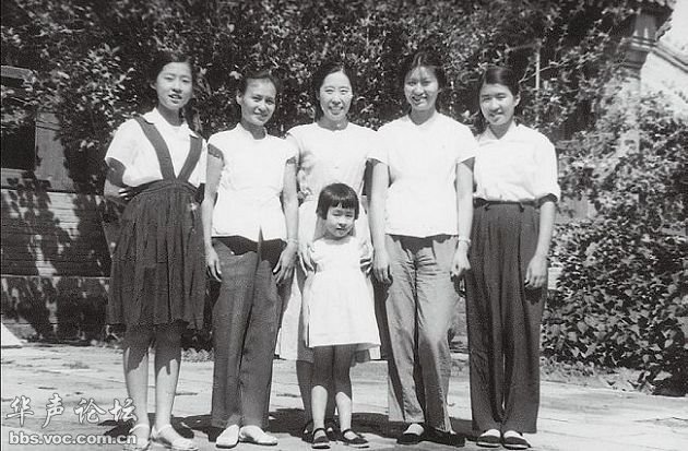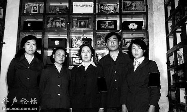 在中南海福禄居前合影。(左起:亭亭、刘爱琴、王光美、涛涛、平平。前:小小)
