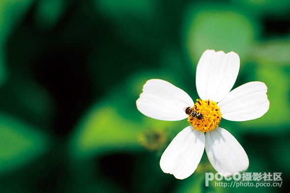 在拍摄花卉时把握蜜蜂靠近的瞬间,让影像更富生命力。
