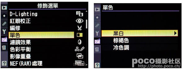 玩家在拍摄时可先行拍摄RAW檔或JPEG档,事后再挑选适当的图片,透过机身内建的修饰选单来加以转换,使用黑、白或其它单色系来为影像进行辅助,藉以凸显影像单纯之美,也是种可行的拍摄手法。