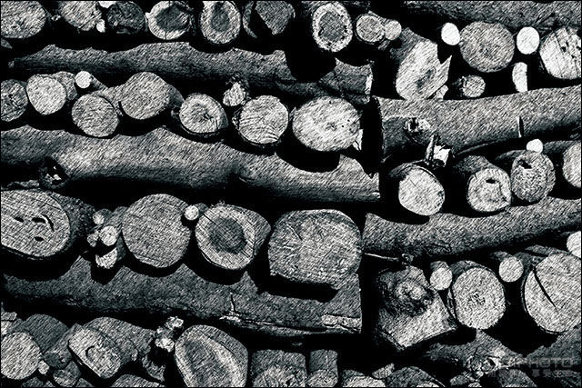 为了强调木头堆放排列的几何线条,特别以黑白素描效果来处理。