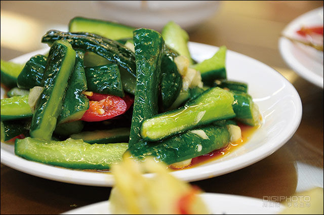 缩小光圈,让盘中的食物细节尽可能的纳入景深范围。
