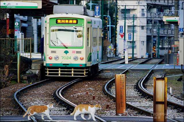 行驶中的电车和悠闲在铁路上散步的猫咪形成有趣的对比。