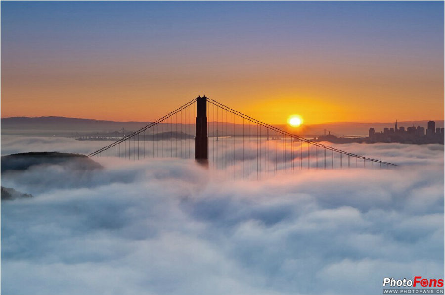 云海日出或日落是自然风光摄影难遇、难拍的一景,天边的太阳为拍摄云海提供出理想的低角度逆光,逆射的阳光为云海勾勒出了漂亮的金色边缘,在万顷金色云波的烘托下,红日冉冉升起或徐徐浸落,气势宏伟壮观。太阳和云海共存的情况下拍摄云海和日出,需要特别注意曝光值的设置。因为太阳的亮度很高,整个场景的光比较大,要解决这个问题,最有效的方法是使用中灰渐变滤镜。